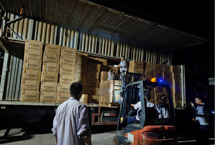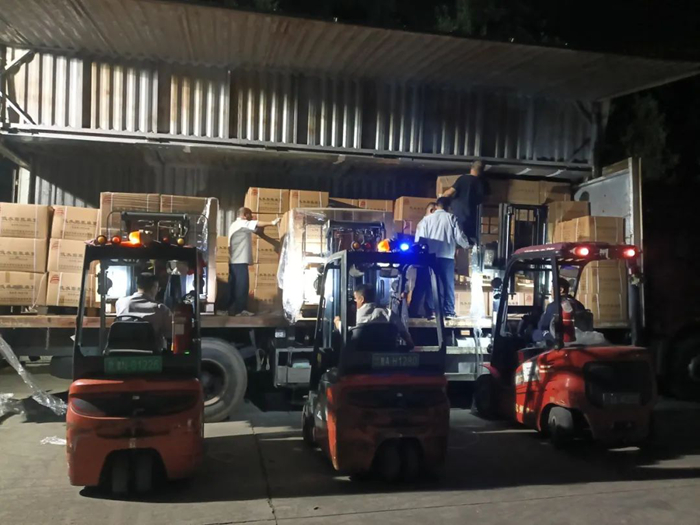 剛剛出庫(kù)完畢,還沒(méi)等干部職工歇歇腳,17時(shí)左右,市應(yīng)急局再次發(fā)來(lái)指令,追加雨衣3700套,華騰化工迅速調(diào)度第5輛專用車輛進(jìn)行物資裝車,干部職工也馬不停蹄地投入到裝載工作中。正在酣戰(zhàn)之時(shí),18時(shí)許,市應(yīng)急局第三道指令接踵而至,追加18000條編織袋和32000條吸水膨脹麻袋。華騰化工再次緊急調(diào)度第6、7輛專用車輛,現(xiàn)場(chǎng)干部職工發(fā)揚(yáng)連續(xù)作戰(zhàn)精神,在3小時(shí)內(nèi)完成全部應(yīng)急物資的裝車、發(fā)貨任務(wù)。