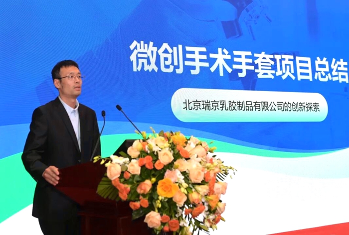 北京瑞京公司研發(fā)工程師仇維高介紹了“雪蓮”微創(chuàng)手術(shù)手套創(chuàng)新研發(fā)過(guò)程。