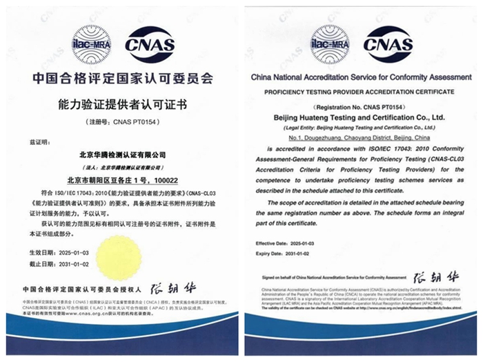 在春節到來之際,華騰檢測傳來好消息,公司成功取得中國合格評定國家認可委員會(CNAS)認可的能力驗證提供者(PTP)認可證書。PTP是能力驗證提供者的簡稱,CNAS是中國合格評定國家認可委員會的簡稱,PTP CNAS是指能力驗證提供者CNAS認可。