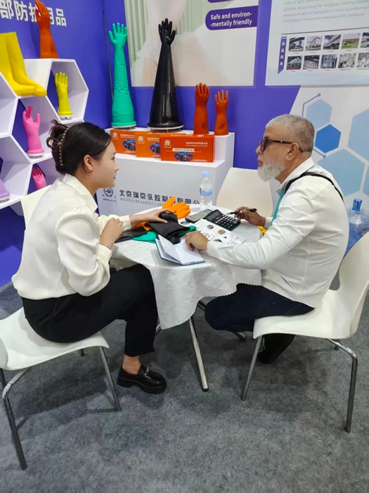 在本屆廣交會(huì)第一期,華騰橡塑與瑞京公司聯(lián)袂登場(chǎng),其中華騰橡塑重點(diǎn)展示了公司創(chuàng)新研發(fā)的濕法混煉天然膠膠板產(chǎn)品;瑞京公司則帶來(lái)了“雪蓮”牌專(zhuān)業(yè)工業(yè)用手套系列產(chǎn)品,吸引了眾多國(guó)際客戶(hù)駐足交流,現(xiàn)場(chǎng)與部分客戶(hù)達(dá)成初步合作意向并計(jì)劃寄送樣品,為后續(xù)深入合作打下良好基礎(chǔ)。
